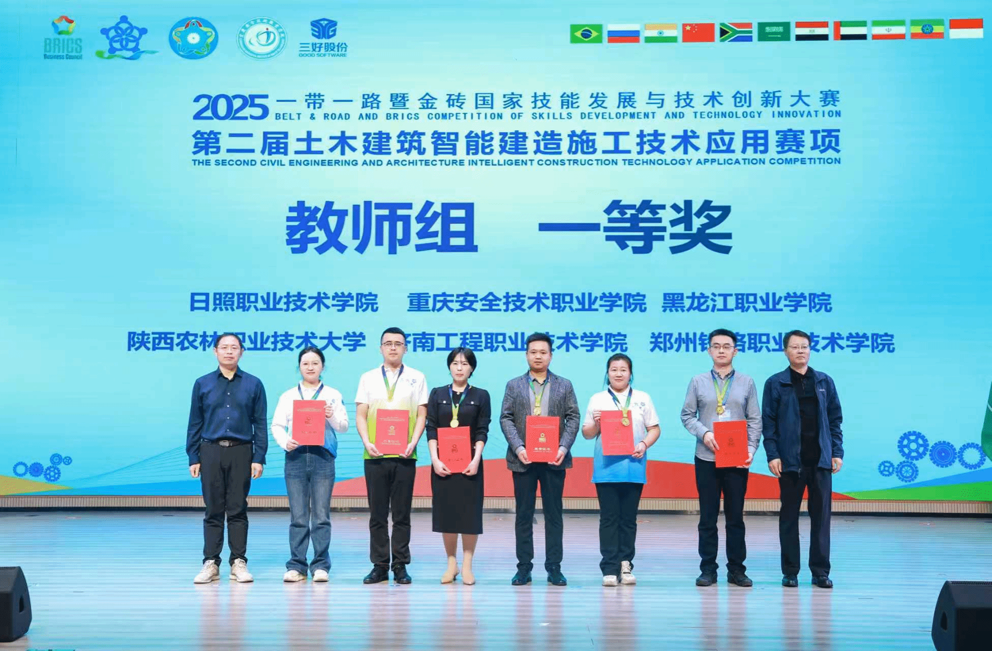 10月17日至19日,2025一带一路暨金砖国家技能发展与技术创新大赛第二届土木建筑智能建造施工技术应用赛项全国总决赛在重庆安全技术职业学院圆满落幕。经激烈比拼,我校建筑工程学院智能建造技术专业学生刘皓名、邓苏滨,凭借扎实的专业技能、优良的职业素养与出色的团队协作,获高职组一等奖,教师苟胜荣、刘鹏飞获教师组一等奖。学校获评高职组与教师组最佳组织奖,指导教师王琦、刘鹏飞获评优秀指导教师。