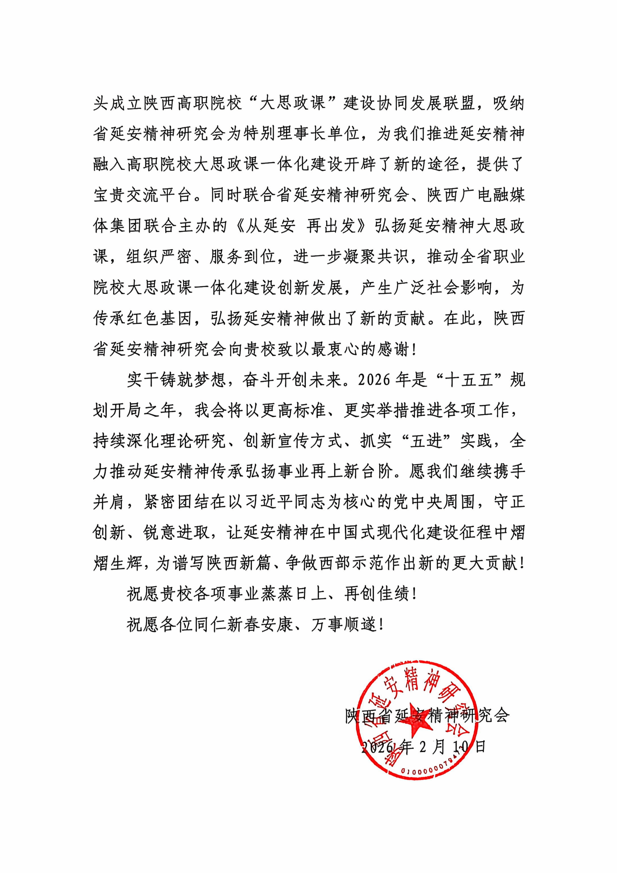 感谢信首先介绍了2025年陕西省延安精神研究会取得的各项工作成效,并表示这些成绩的取得离不开学校的鼎力支持。学校牵头成立陕西高职院校“大思政课”建设协同发展联盟,吸纳研究会为特别理事长单位,还联合研究会、陕西广电融媒体集团主办《从延安再出发》大思政课,为延安精神融入高职思政教育开辟新路径,产生广泛社会影响。