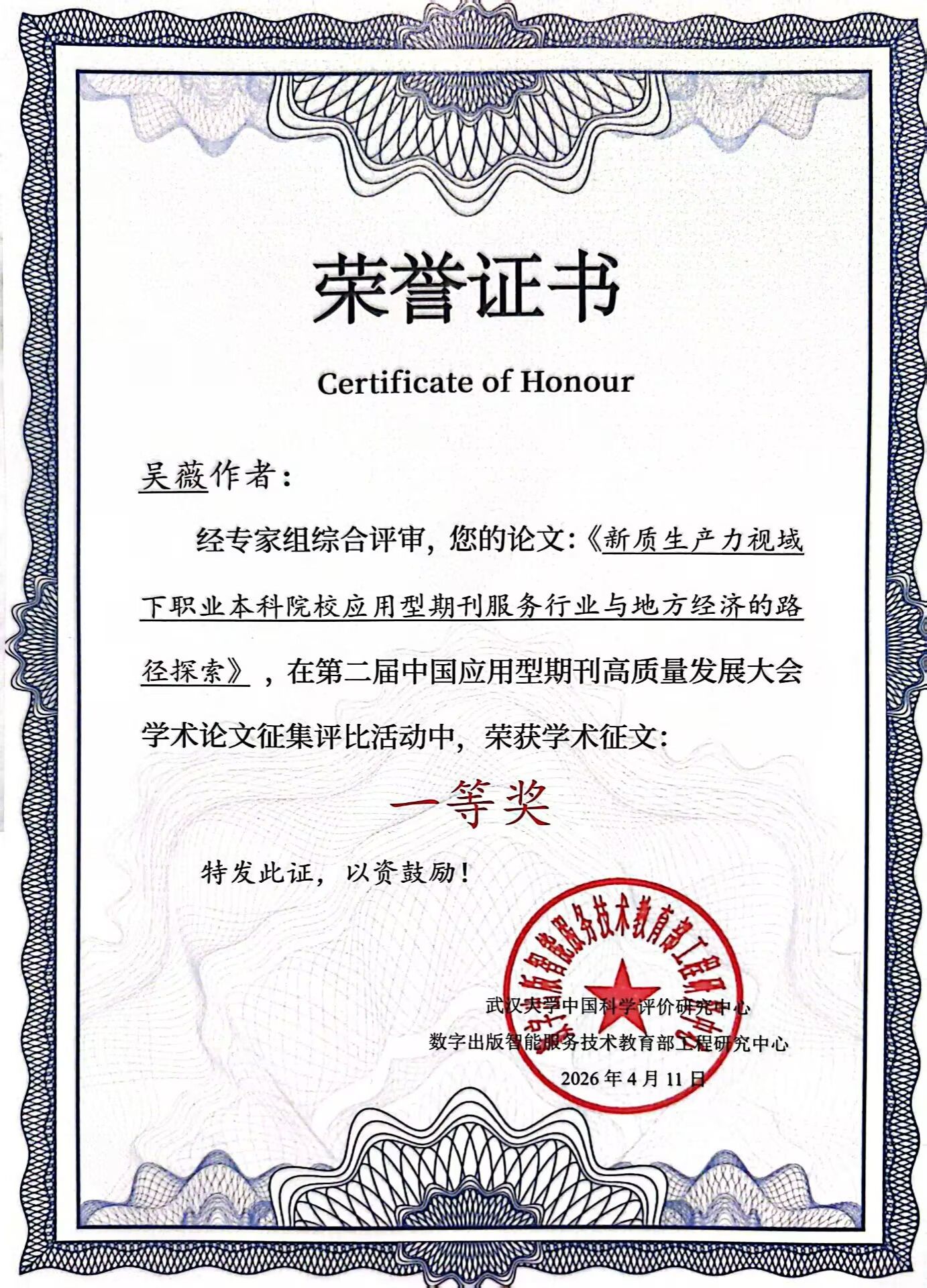 4月10日,武汉大学中国科学评价研究中心、数字出版智能服务技术教育部工程研究中心联合发布了中国应用型期刊评价研究报告,《杨凌职业技术学院学报》再次入选CACJ(China Applied Core Journal)中国应用型核心期刊。学报编辑部责任编辑吴薇撰写的论文《新质生产力视域下职业本科院校应用型期刊服务行业与地方经济的路径探索》获第二届中国应用型期刊高质量发展大会学术征文一等奖。