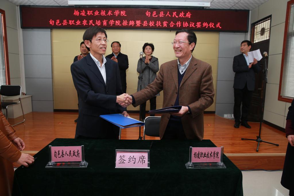 在旬邑县职业农民培育学院挂牌暨县校扶贫合作签字仪式上,李晓静与王周锁共同为我院旬邑县职业农民培育学院揭牌,任得元与张勇代表双方签订了《关于加强产学研结合促进经济发展的合作协议书》。