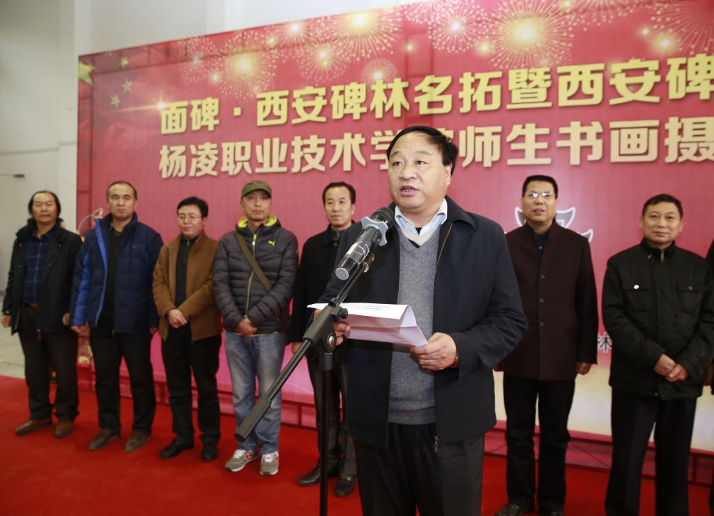 王冰在介绍展览基本情况时说到,西安碑林博物馆书法艺术中心自2011年3月成立以来,以“面碑”为主题的书法展,先后走进河南洛阳、信阳,湖北钟祥,陕西宝鸡、渭南、汉中、延安、深圳、拉萨以及韩国等地区和国家。此次《面碑•西安碑林名拓暨西安碑林书法家、杨凌职业技术学院师生书画摄影作品展》在杨凌展出,是“面碑”书法展的第20站。希望杨凌职业技术学院师生能够通过此次展览,实现与经典零距离,与名家面对面,感受传统文化的神奇魅力。同时,为师生们欣赏和学习书画摄影艺术提供有益的借鉴。