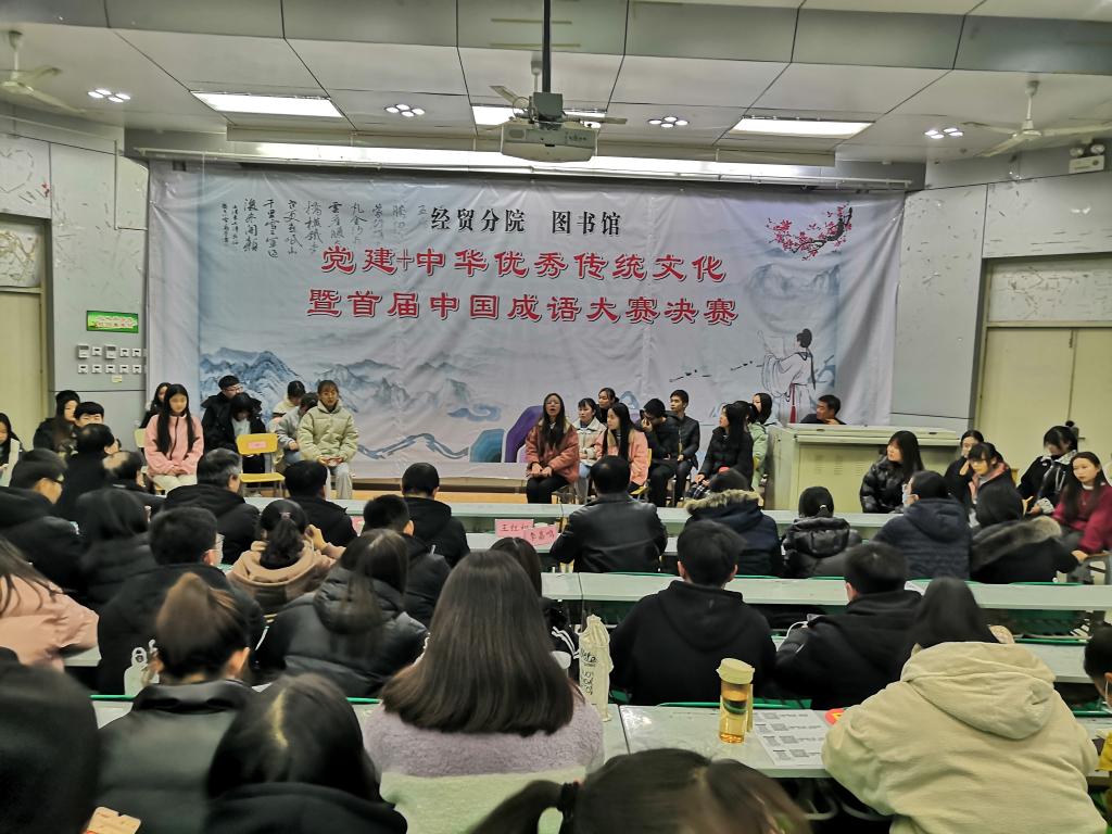 12月17日晚,经济与贸易分院与图书馆联合举行党建+中华优秀传统文化暨首届中国成语大赛决赛。图书馆馆长王红相、文理分院院长王云江、经贸分院党总支书记李嘉鸣、副院长郑伟出席活动,从初赛的62名选手中选拔出的30名选手参加了比赛,大一大二学生代表共计200余人观看了比赛