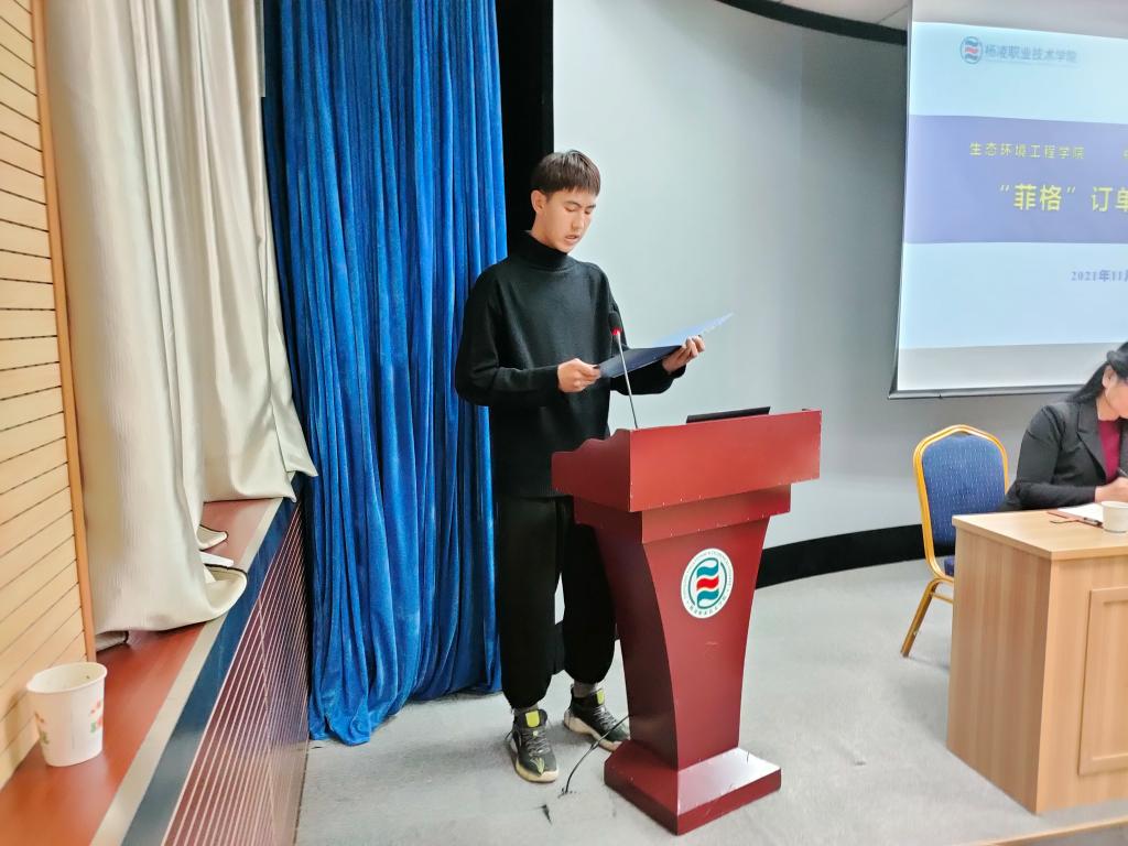 仪式上,王青宁与刘琳文签订人才培养协议。经双方共同推荐,由林业教研室张莹老师和菲格庄园总经理闫妍担任“菲格”订单班的学业指导老师,分别负责学生在校内和校外的学习与实践。学生代表李庭在仪式上发言。