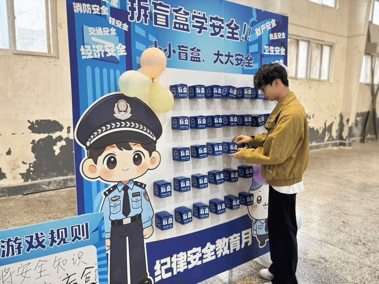 安全体验活动围绕消防安全、交通安全、网络安全、宿舍安全等方面创新设置了5个趣味体验环节。“认标识・套平安”通过套圈答题助力学生快速记忆交通标识;反诈“沙包大作战”以投掷互动强化反诈意识;“击倒键盘侠”环节引导学生树立文明上网、拒绝网络暴力的理念;“拆盲盒学安全”将安全知识融入惊喜体验,提升学习趣味性;“乒击校园贷 青春不负债”则通过乒乓球游戏,让学生认清校园贷危害,坚定拒绝校园贷的信念。