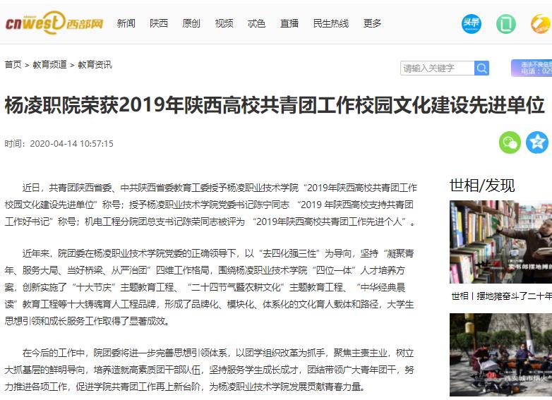 【西部网】杨凌职院荣获2019年陕西高校共青团工作校园文化建设先进单位