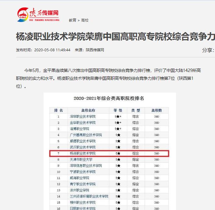 【陕西传媒网】杨凌职业技术学院荣膺中国高职高专院校综合竞争力排行榜第7位