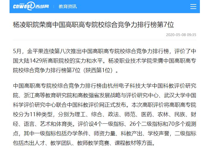 【西部网】杨凌职院荣膺中国高职高专院校综合竞争力排行榜第7位