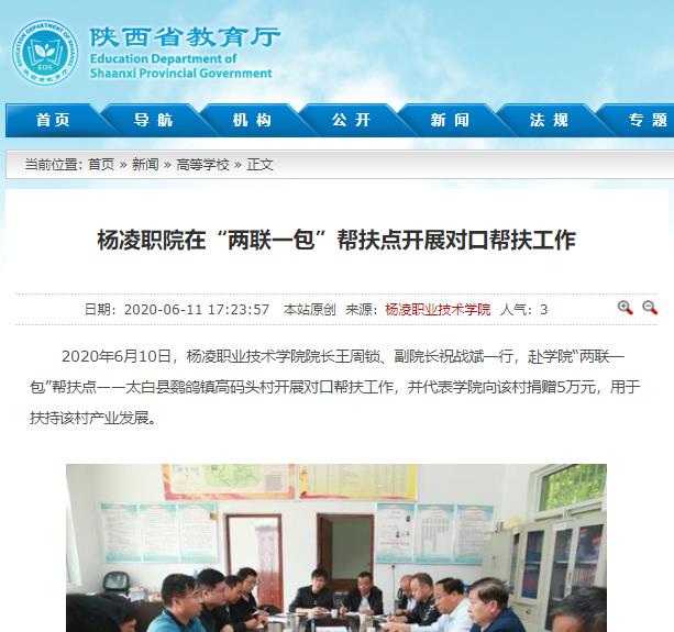 2020年6月10日,杨凌职业技术学院院长王周锁、副院长祝战斌一行,赴学院“两联一包”帮扶点——太白县鹦鸽镇高码头村开展对口帮扶工作,并代表学院向该村捐赠5万元,用于扶持该村产业发展。