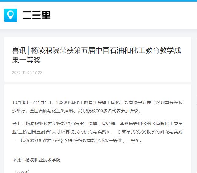 【二三里】喜讯│杨凌职院荣获第五届中国石油和化工教育教学成果一等奖