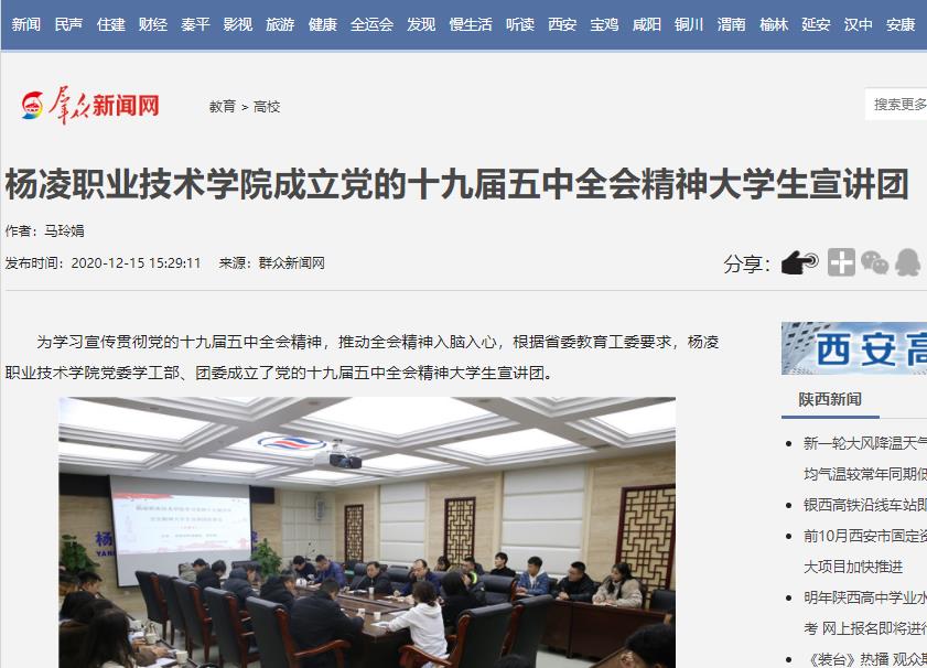 为学习宣传贯彻党的十九届五中全会精神,推动全会精神入脑入心,根据省委教育工委要求,杨凌职业技术学院党委学工部、团委成立了党的十九届五中全会精神大学生宣讲团。