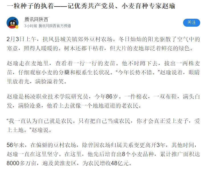 【腾讯网】一粒种子的执着——记优秀共产党员、小麦育种专家赵瑜