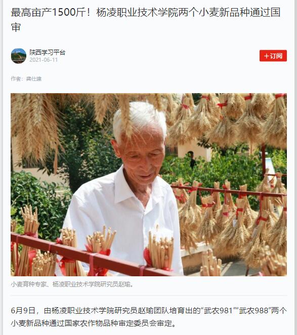 6月9日,由杨凌职业技术学院研究员赵瑜团队培育出的“武农981”“武农988”两个小麦新品种通过国家农作物品种审定委员会审定。