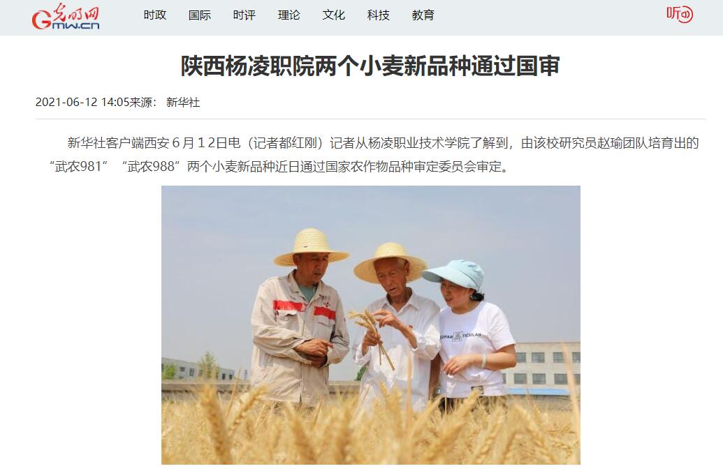 新华社客户端西安6月12日电(记者都红刚)记者从杨凌职业技术学院了解到,由该校研究员赵瑜团队培育出的“武农981”“武农988”两个小麦新品种近日通过国家农作物品种审定委员会审定。