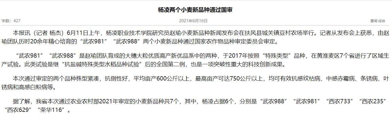 【陕西农村报】杨凌两个小麦新品种通过国审