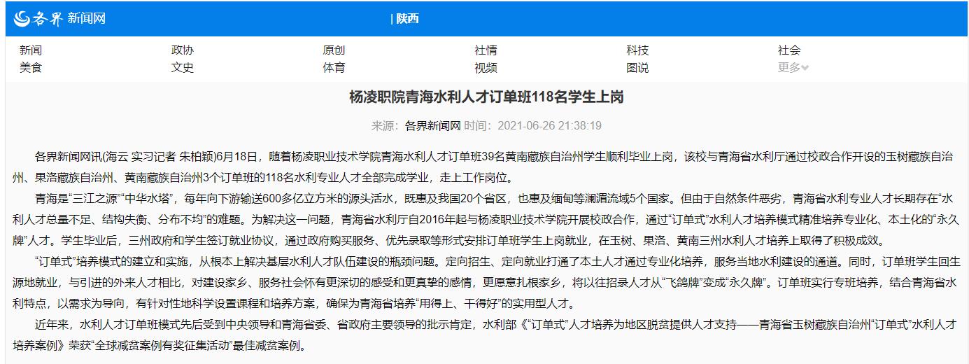 【各界新闻网】杨凌职院青海水利人才订单班118名学生上岗