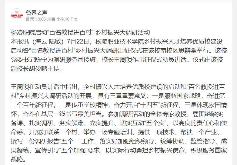 【各界之声】杨凌职院启动“百名教授进百村” 乡村振兴大调研活动