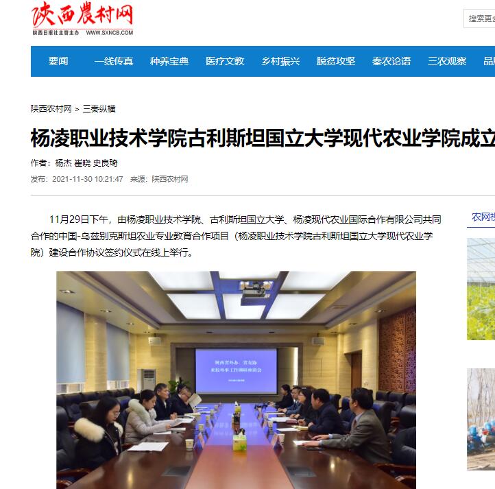 11月29日下午,由杨凌职业技术学院、古利斯坦国立大学、杨凌现代农业国际合作有限公司共同合作的中国-乌兹别克斯坦农业专业教育合作项目(杨凌职业技术学院古利斯坦国立大学现代农业学院)建设合作协议签约仪式在线上举行。