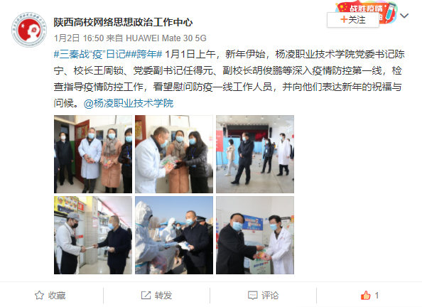 1月1日上午,新年伊始,杨凌职业技术学院党委书记陈宁、校长王周锁、党委副书记任得元、副校长胡俊鹏等深入疫情防控第一线,检查指导疫情防控工作,看望慰问防疫一线工作人员,并向他们表达新年的祝福与问候。
