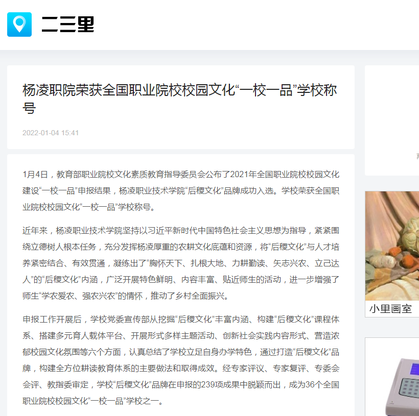 【二三里】杨凌职院荣获全国职业院校校园文化“一校一品”学校称号