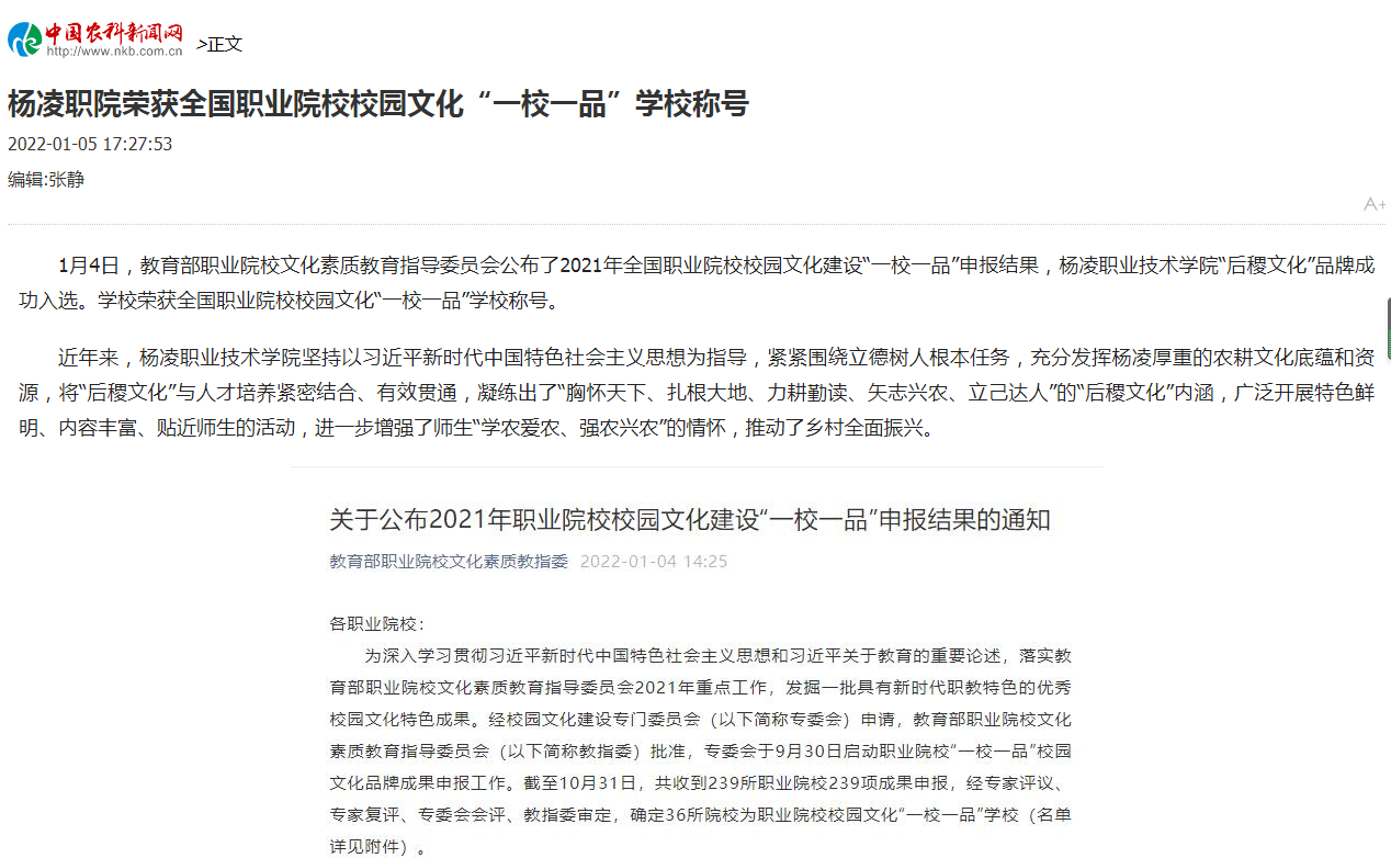 1月4日,教育部职业院校文化素质教育指导委员会公布了2021年全国职业院校校园文化建设“一校一品”申报结果,杨凌职业技术学院“后稷文化”品牌成功入选。学校荣获全国职业院校校园文化“一校一品”学校称号。