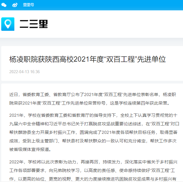 【二三里】杨凌职院获陕西高校2021年度“双百工程”先进单位