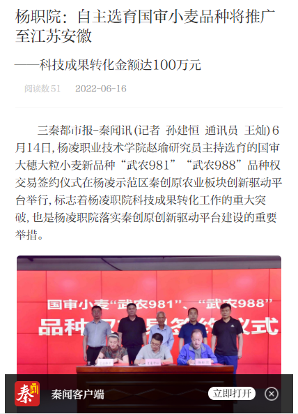三秦都市报-秦闻讯(记者 孙建恒 通讯员 王灿)6月14日,杨凌职业技术学院赵瑜研究员主持选育的国审大穗大粒小麦新品种“武农981”“武农988”品种权交易签约仪式在杨凌示范区秦创原农业板块创新驱动平台举行,标志着杨凌职院科技成果转化工作的重大突破,也是杨凌职院落实秦创原创新驱动平台建设的重要举措。