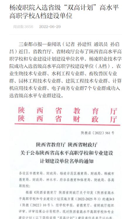 【三秦都市报】杨凌职院入选省级“双高计划”高水平高职学校A档建设单位