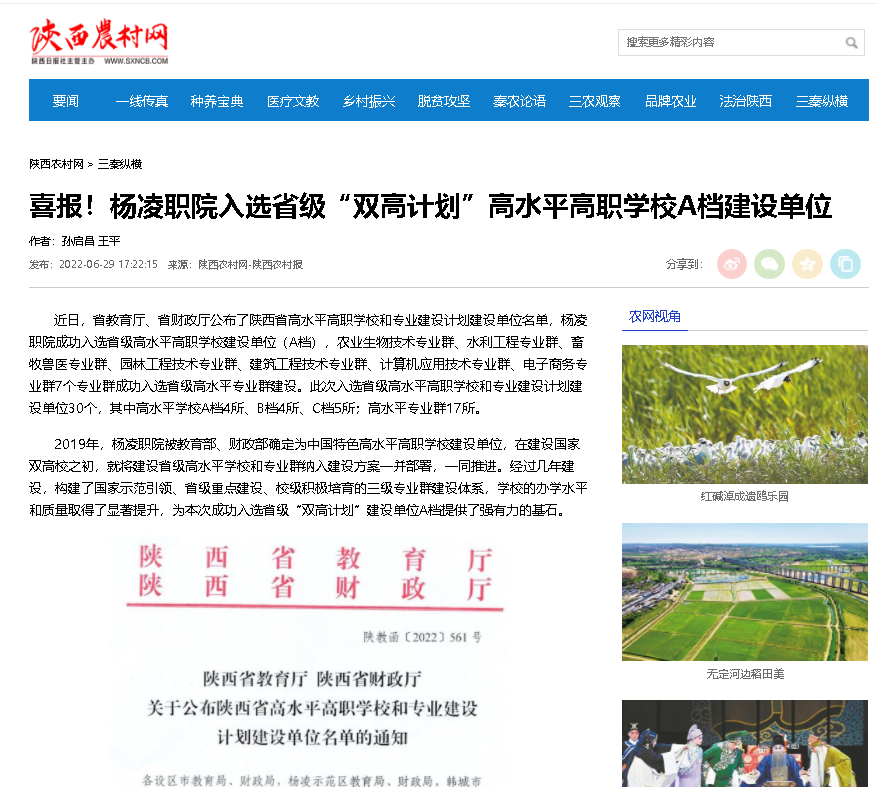 【陕西农村报】喜报!杨凌职院入选省级“双高计划”高水平高职学校A档建设单位