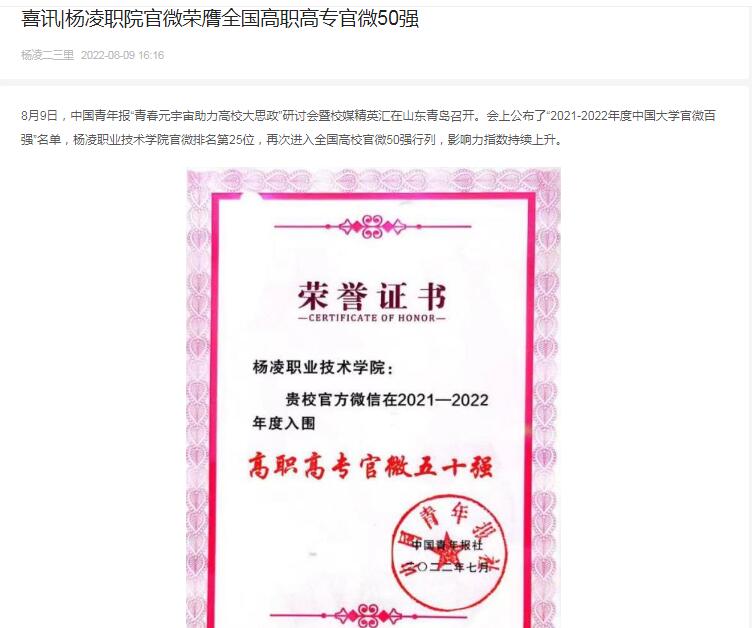 【二三里】喜讯|杨凌职院官微荣膺全国高职高专官微50强