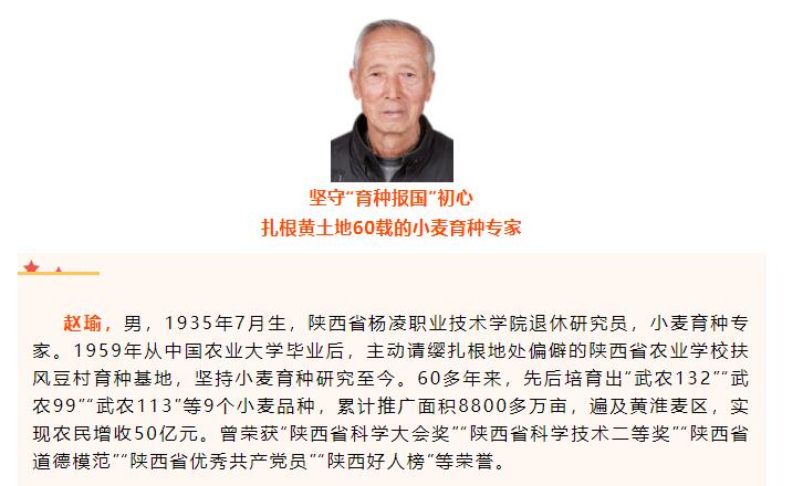 赵瑜, 男,1935年7月生,陕西省杨凌职业技术学院退休研究员,小麦育种专家。1959年从中国农业大学毕业后,主动请缨扎根地处偏僻的陕西省农业学校扶风豆村育种基地,坚持小麦育种研究至今。60多年来,先后培育出“武农132”“武农99”“武农113”等9个小麦品种,累计推广面积8800多万亩,遍及黄淮麦区,实现农民增收50亿元。曾荣获“陕西省科学大会奖”“陕西省科学技术二等奖”“陕西省道德模范”“陕西省优秀共产党员”“陕西好人榜”等荣誉。