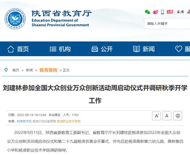 2022年9月15日,陕西省委教育工委副书记、省教育厅厅长刘建林赴杨凌参加2022年全国大众创业万众创新活动周启动仪式和第二十九届杨凌农高会开幕式,并先后赴杨凌高新第六幼儿园、高新第四小学和杨凌职业技术学院调研指导。
