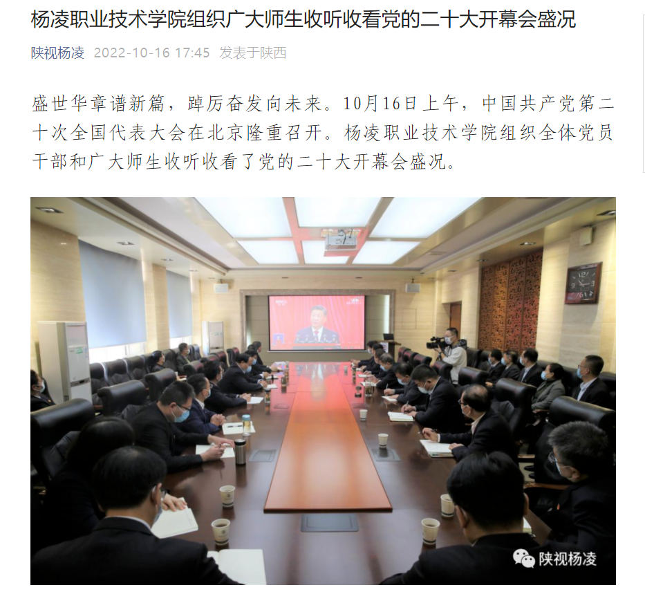 盛世华章谱新篇,踔厉奋发向未来。10月16日上午,中国共产党第二十次全国代表大会在北京隆重召开。杨凌职业技术学院组织全体党员干部和广大师生收听收看了党的二十大开幕会盛况。