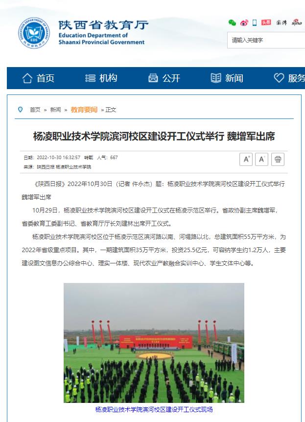 【陕西省教育厅】杨凌职业技术学院滨河校区建设开工仪式举行 魏增军出席