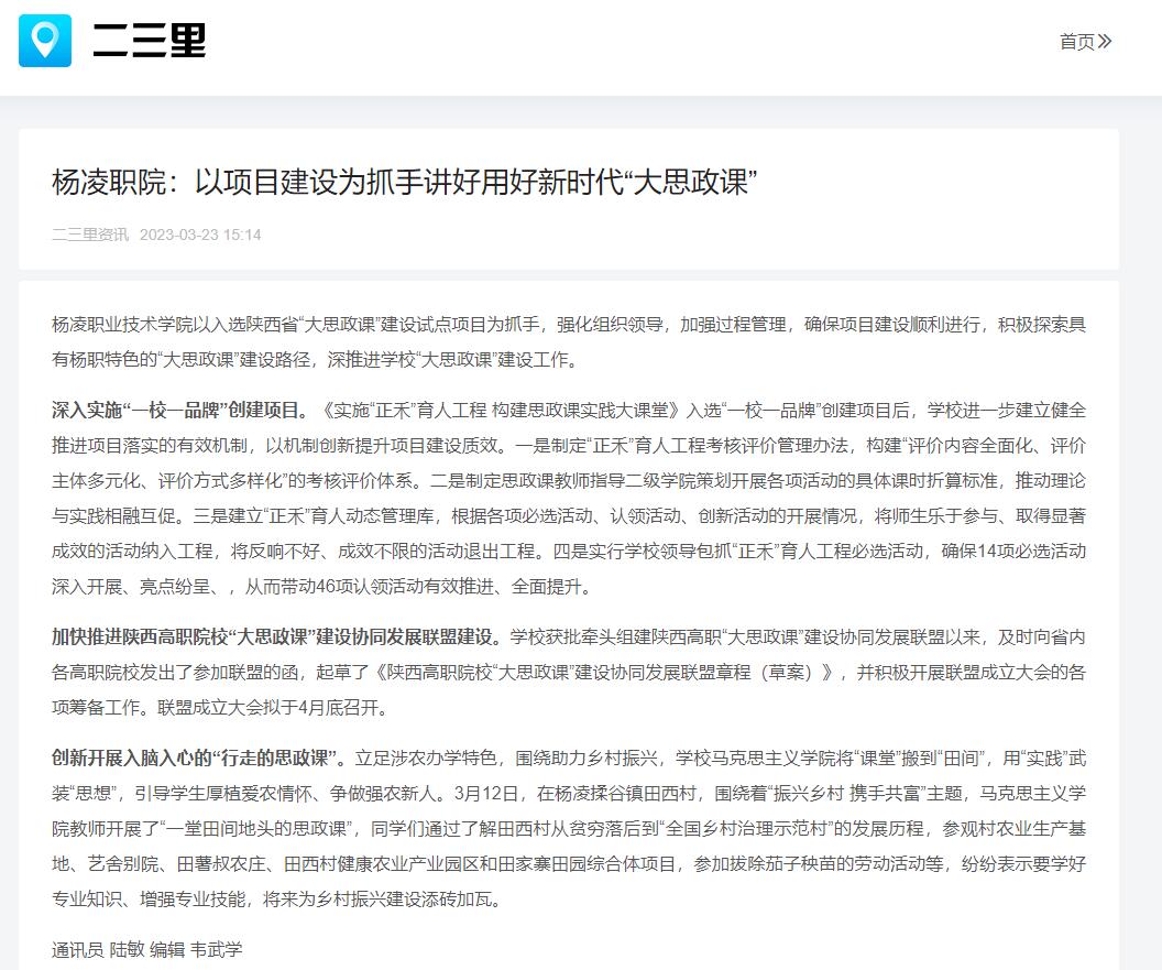 杨凌职业技术学院以入选陕西省“大思政课”建设试点项目为抓手,强化组织领导,加强过程管理,确保项目建设顺利进行,积极探索具有杨职特色的“大思政课”建设路径,深推进学校“大思政课”建设工作。