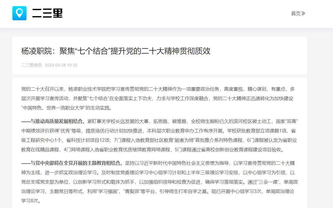 党的二十大召开以来,杨凌职业技术学院把学习宣传贯彻党的二十大精神作为一项重要政治任务,高度重视,精心谋划,有重点、多层次开展学习宣传活动,并聚焦“七个结合”在全面落实上下功夫,力求与学校工作深度融合,党的二十大精神正迅速转化为加快建设“中国特色、世界一流职业大学”的生动实践。