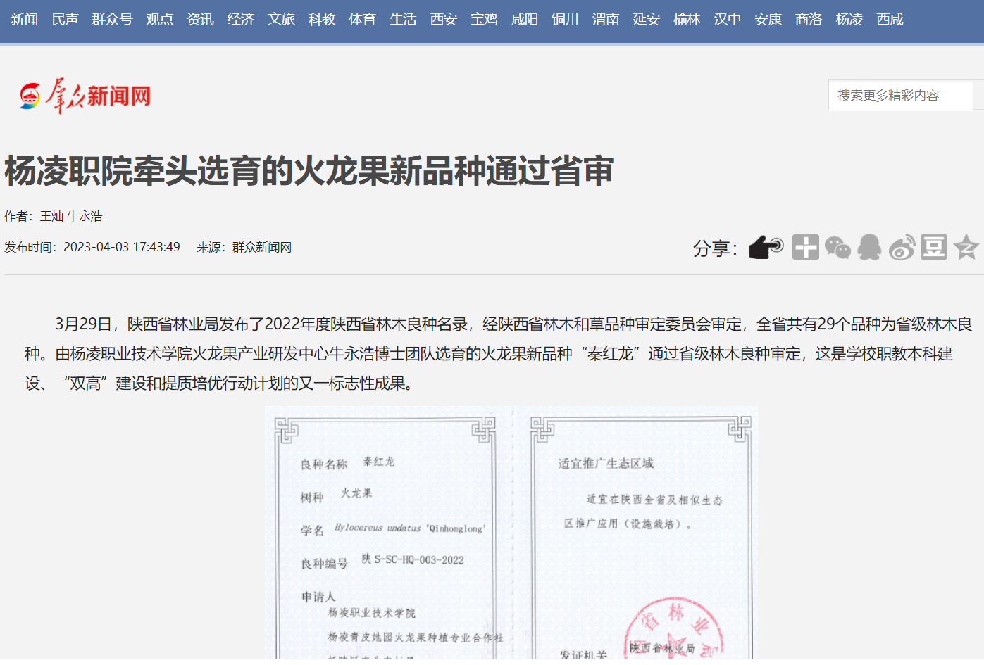 【群众新闻网】杨凌职院牵头选育的火龙果新品种通过省审