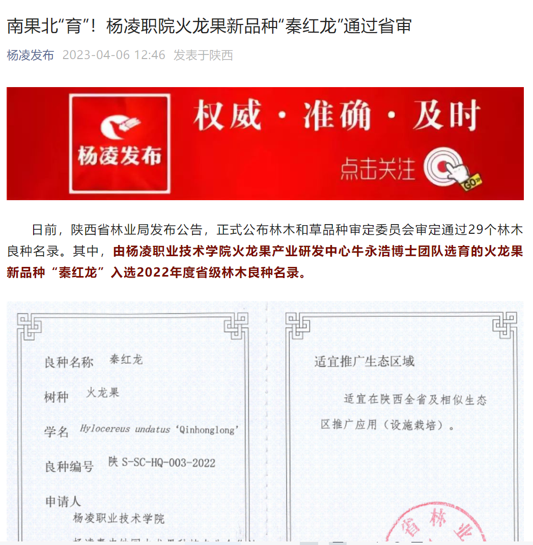 日前,陕西省林业局发布公告,正式公布林木和草品种审定委员会审定通过29个林木良种名录。其中,由杨凌职业技术学院火龙果产业研发中心牛永浩博士团队选育的火龙果新品种“秦红龙”入选2022年度省级林木良种名录。