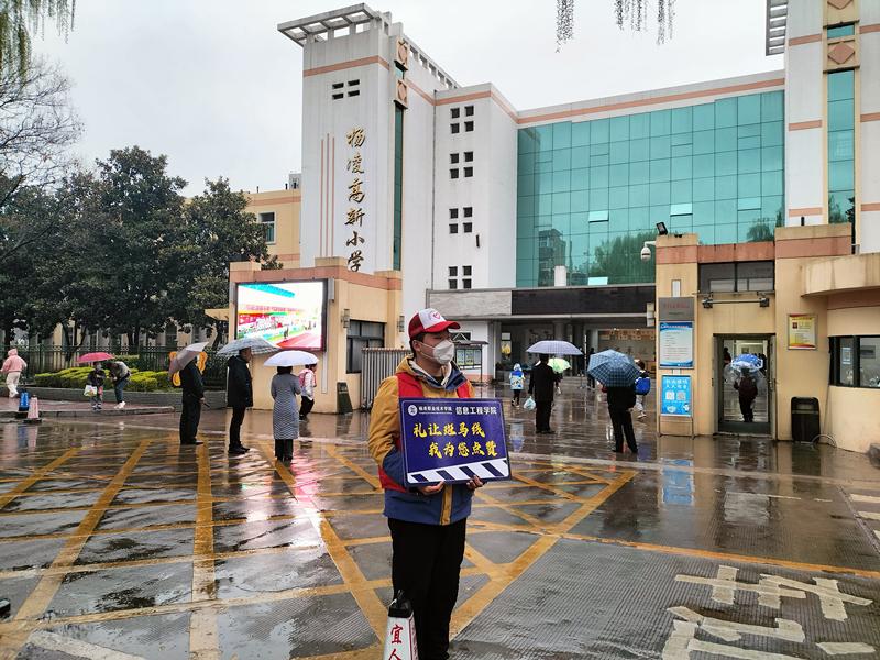 ——“出行有礼爱心护学”中小学生上下学交通秩序维护。3月17日至21日,志愿者们定时、定点、定岗在杨陵高级中学、杨陵小学、高新小学、张家岗小学等学校外交通拥堵路段,开展上下学交通秩序维护活动。对过往车辆进行管控、疏导,对放学队伍进行护送,引导学生家长有序停放车辆、即停即走,确保学校附近道路安全畅通,增强了学生和家长们的交通意识和自我防护意识。
