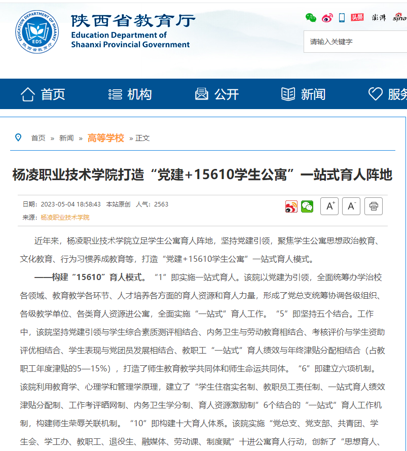 【陕西省教育厅】杨凌职业技术学院打造“党建+15610学生公寓”一站式育人阵地