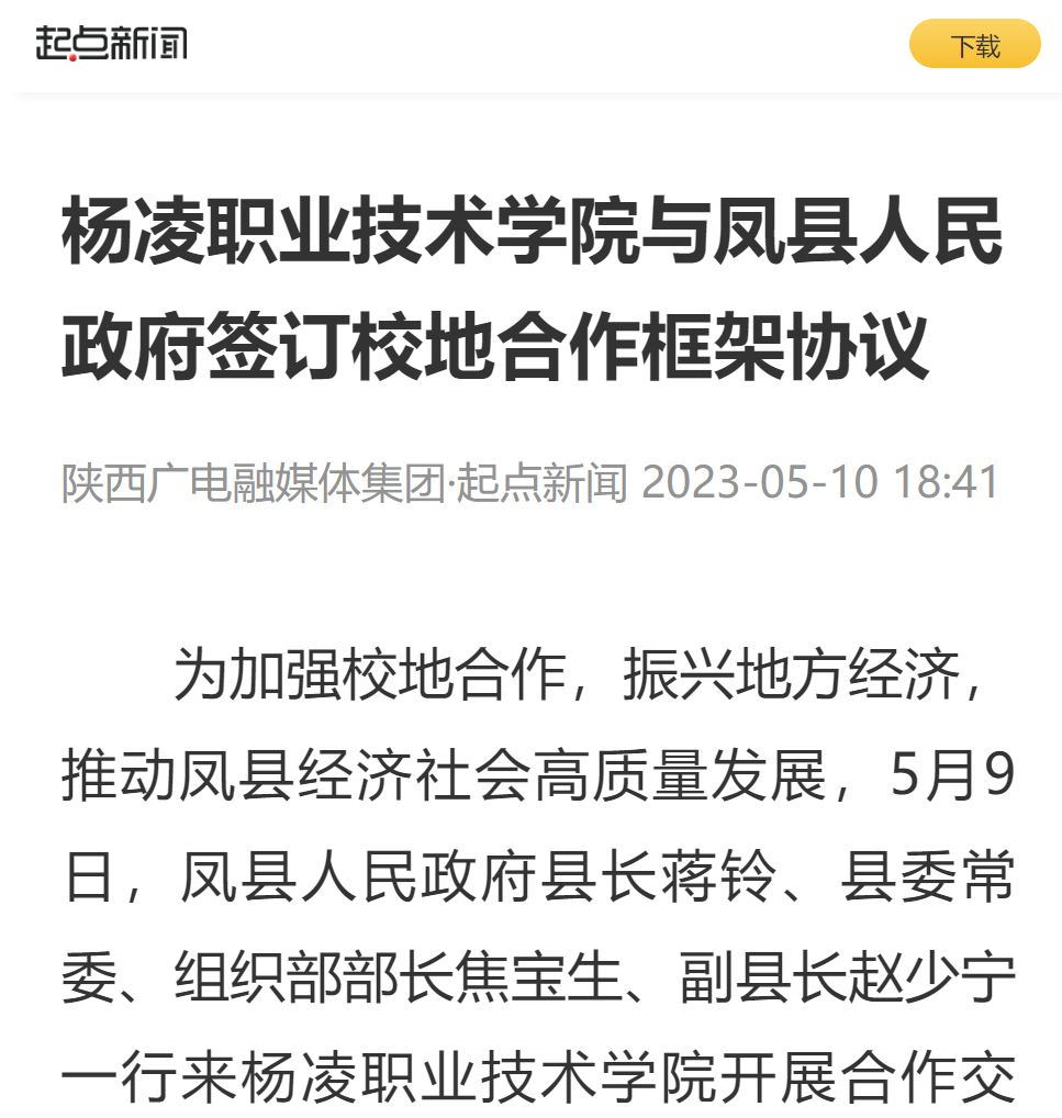 【起点新闻】杨凌职业技术学院与凤县人民政府签订校地合作框架协议