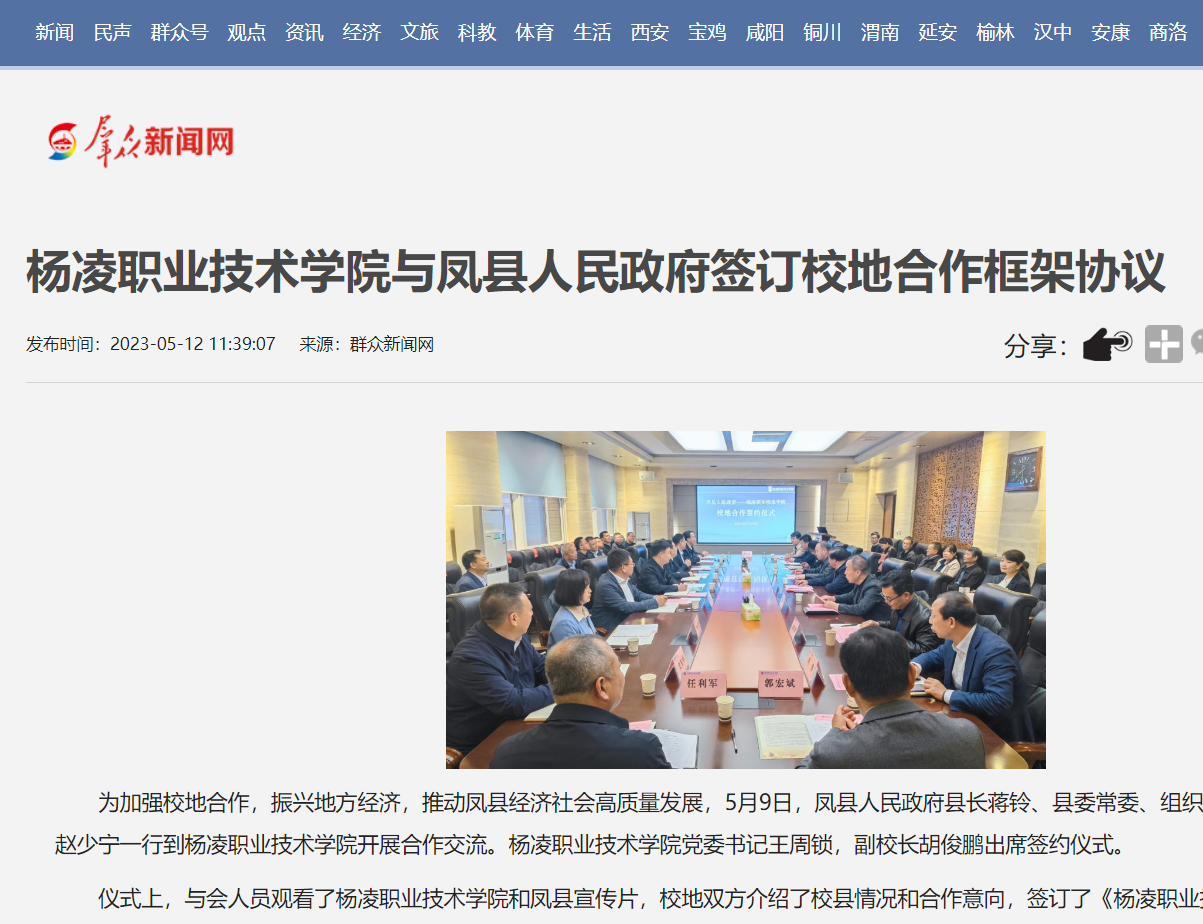 【群众新闻网】杨凌职业技术学院与凤县人民政府签订校地合作框架协议