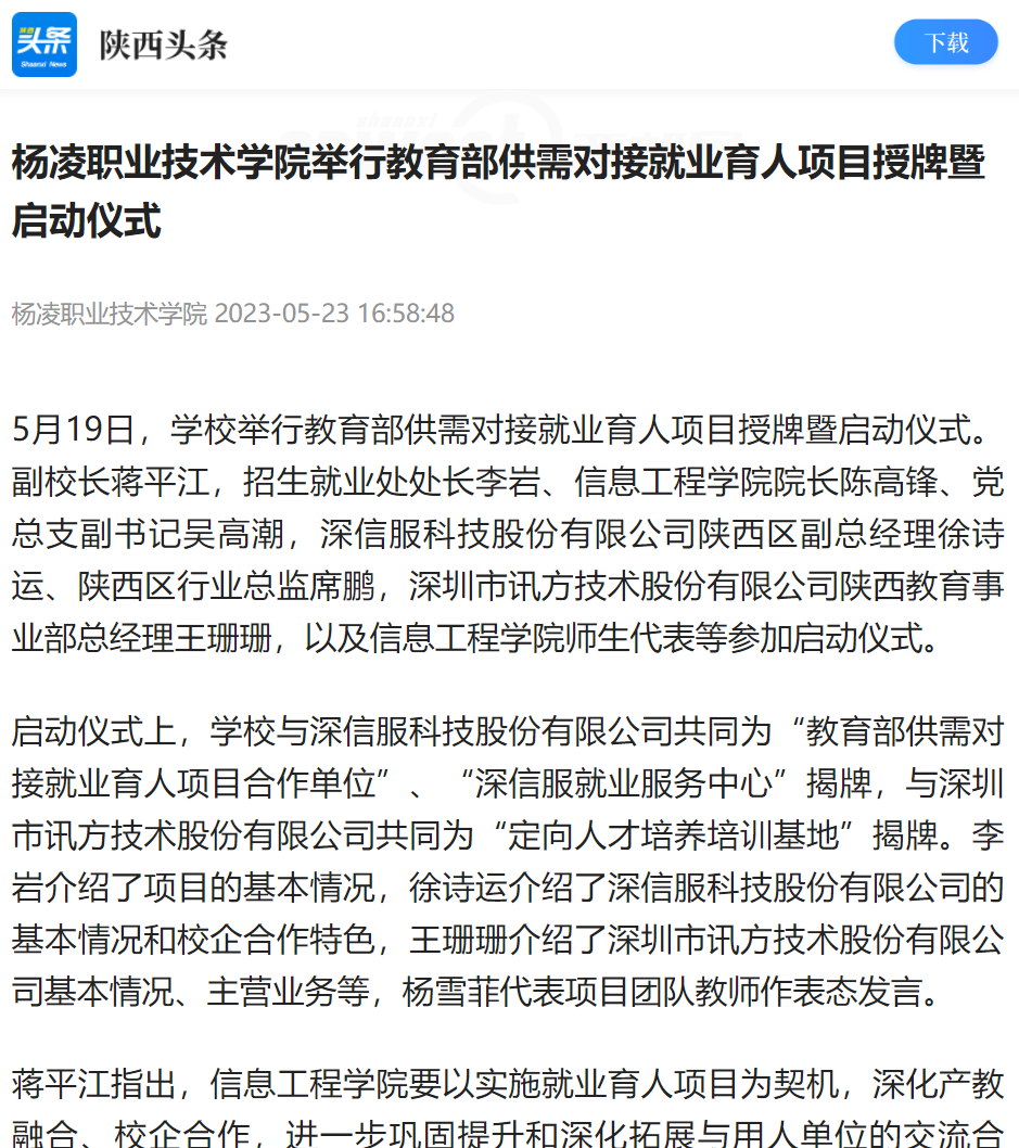 5月19日,学校举行教育部供需对接就业育人项目授牌暨启动仪式。副校长蒋平江,招生就业处处长李岩、信息工程学院院长陈高锋、党总支副书记吴高潮,深信服科技股份有限公司陕西区副总经理徐诗运、陕西区行业总监席鹏,深圳市讯方技术股份有限公司陕西教育事业部总经理王珊珊,以及信息工程学院师生代表等参加启动仪式。