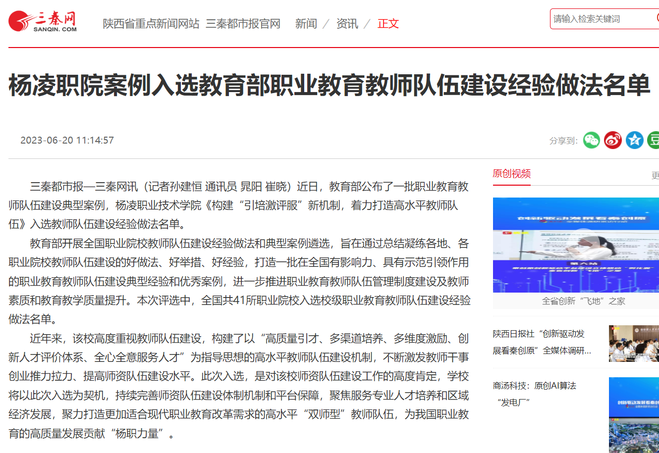 【三秦都市报】杨凌职院案例入选教育部职业教育教师队伍建设经验做法名单