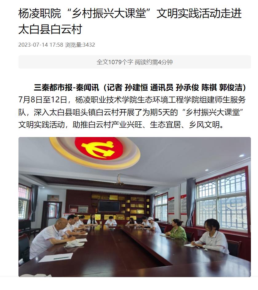 三秦都市报-秦闻讯(记者 孙建恒 通讯员 孙承俊 陈祺 郭俊洁) 7月8日至12日,杨凌职业技术学院生态环境工程学院组建师生服务队,深入太白县咀头镇白云村开展了为期5天的“乡村振兴大课堂”文明实践活动,助推白云村产业兴旺、生态宜居、乡风文明。