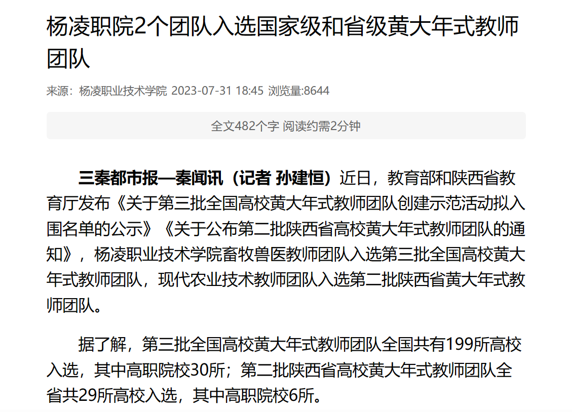 【秦闻】杨凌职院2个团队入选国家级和省级黄大年式教师团队