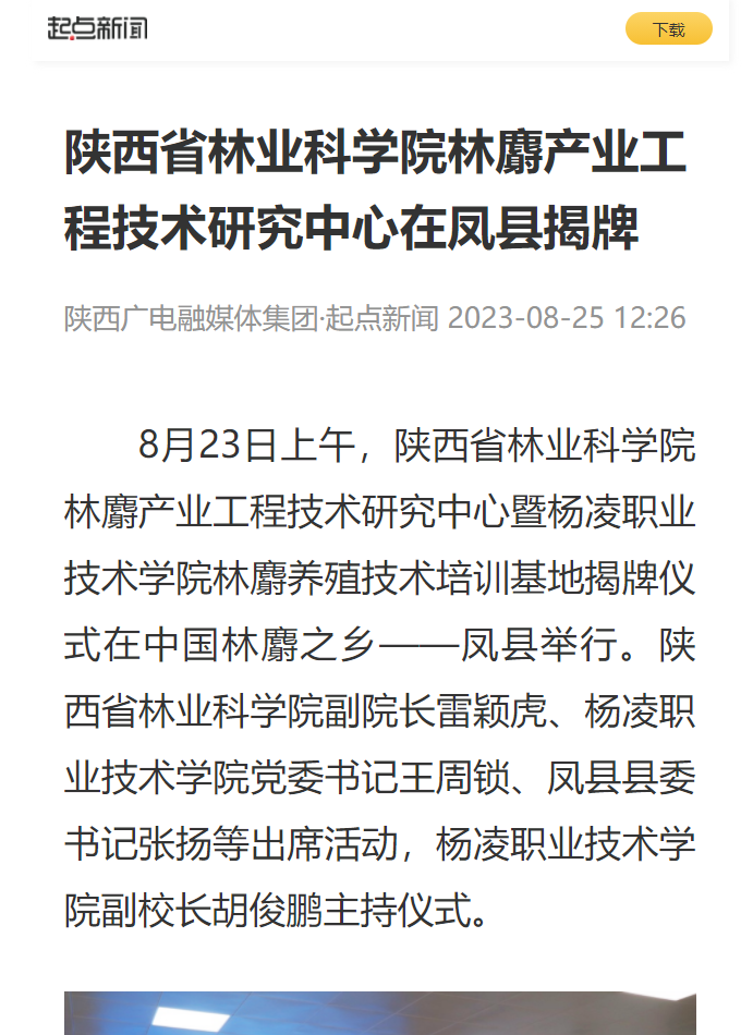 8月23日上午,陕西省林业科学院林麝产业工程技术研究中心暨杨凌职业技术学院林麝养殖技术培训基地揭牌仪式在中国林麝之乡——凤县举行。陕西省林业科学院副院长雷颖虎、杨凌职业技术学院党委书记王周锁、凤县县委书记张扬等出席活动,杨凌职业技术学院副校长胡俊鹏主持仪式。