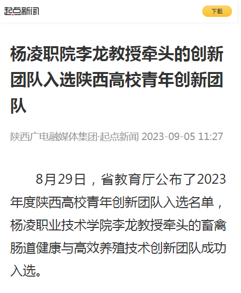 8月29日,省教育厅公布了2023年度陕西高校青年创新团队入选名单,杨凌职业技术学院李龙教授牵头的畜禽肠道健康与高效养殖技术创新团队成功入选