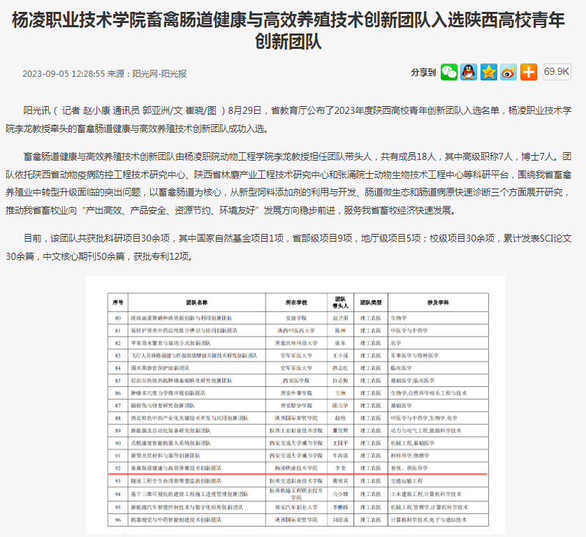 阳光讯( 记者 赵小康 通讯员 郭亚洲/文 崔晓/图 )8月29日,省教育厅公布了2023年度陕西高校青年创新团队入选名单,杨凌职业技术学院李龙教授牵头的畜禽肠道健康与高效养殖技术创新团队成功入选。