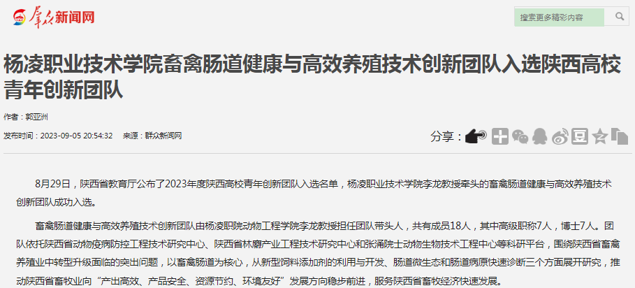 【群众新闻网】杨凌职业技术学院畜禽肠道健康与高效养殖技术创新团队入选陕西高校青年创新团队