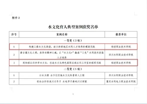 10月31日,中国水利教育协会公布了第三届水利职业院校水文化育人研讨会相关成果评选结果。杨凌职业技术学院水利工程学院报送的《构建三秦水文化族谱,助力西部地区水利人才培养的螺旋实践》和《我和班主任共学水文化:打造水文化特色高职名班主任工作室的探索实践》2个案例获水文化育人典型案例一等奖,党委宣传部报送的《挖掘后稷文化 传承千年文脉 打造杨职特色文明校园品牌》案例获文明校园建设典型案例一等奖。